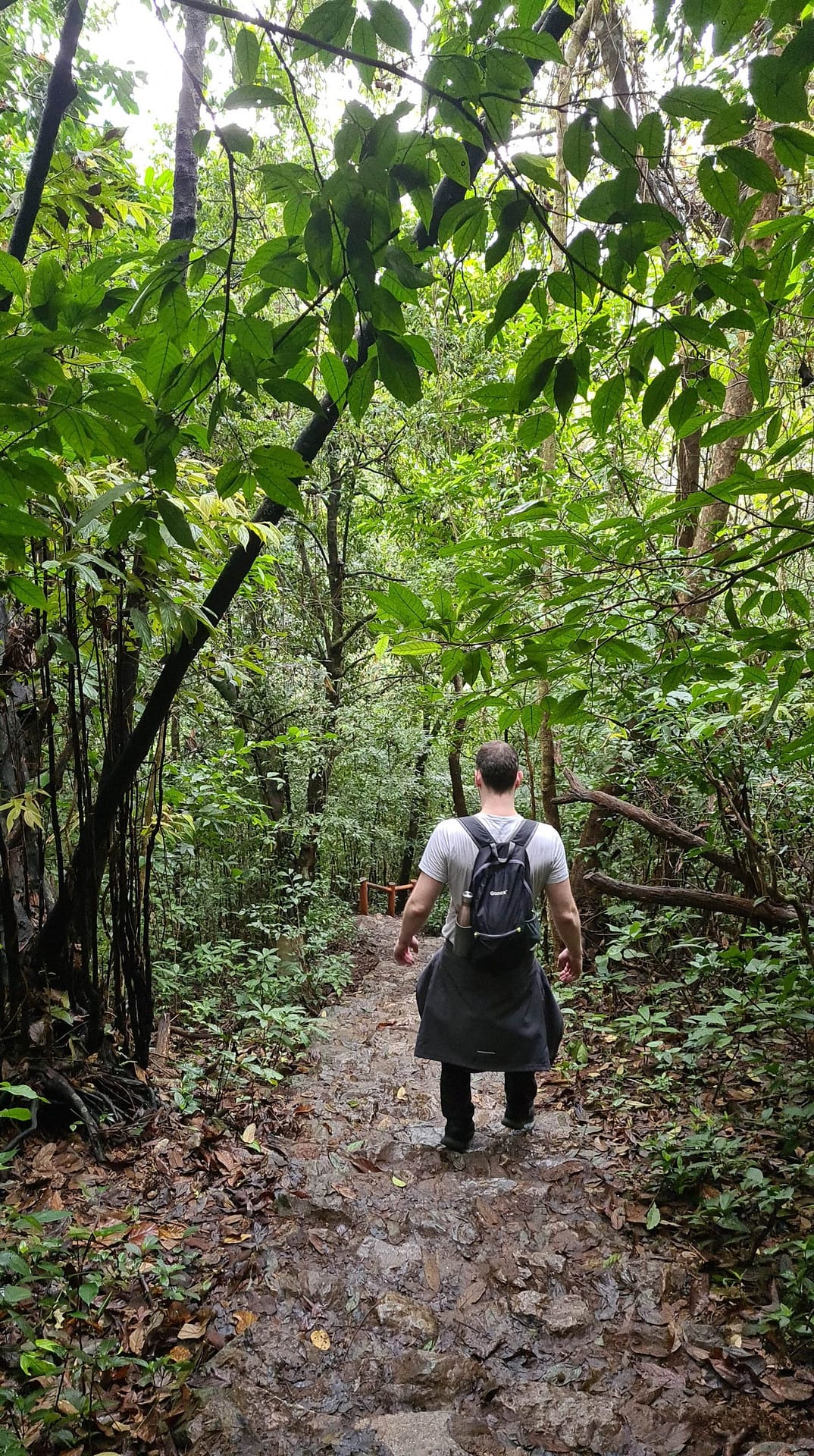 Nächster Halt war dann ein paar hundert Meter weiter entfernt der Parkplatz des Nationalparks. Hier haben wir umgerechnet ein paar Cent für den Rollerparkplatz zahlen müssen und haben uns dann auf den Weg zur Aussichtsplattform des Nationalparks gemacht. Unser Aufstieg durch den Dschungel dauerte eine gute Stunde, bis wir erschöpft oben ankamen. Dort waren etwa zehn andere Personen, aber dennoch hielt es sich das Personenaufkommen auf der kleinen Plattform sehr in Grenzen. Nachdem wir eine kurze Rast eingelegt und die Aussicht genossen hatten, machten wir uns auf den Weg nach unten. Wir entschieden uns für den selben Rückweg, den wir zum Aufstieg nahmen, da wir gehört haben wie einige auf dem Aussichtspunkt sagten, dass der Weg in die andere Richtung ein Rundweg durch den ganzen Nationalpark sei und über fünf Stunden in Anspruch nehmen würde.