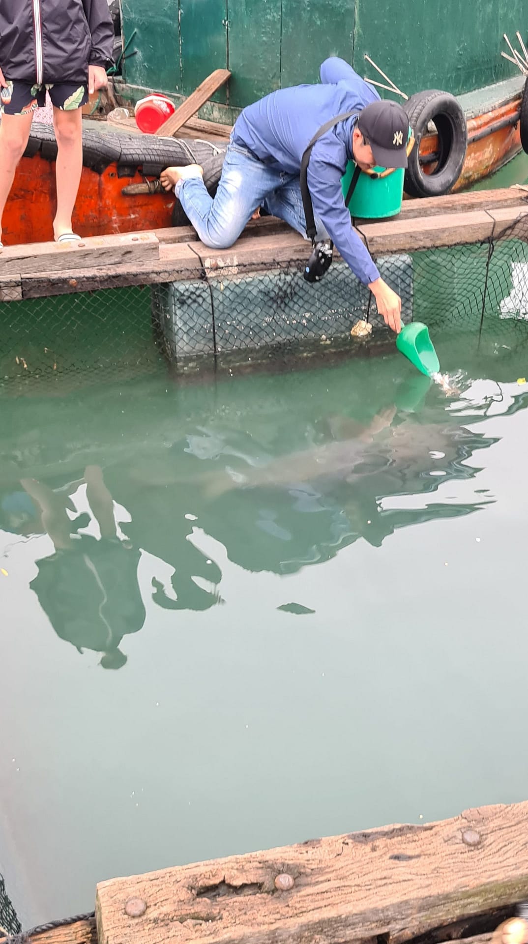 Auch der Besuch auf der Fischfarm war super interessant. Die Farm schwimmt auf dem Wasser und in großen Netzen werden verschiedenste Fische, die im Meer gefangen wurden angefüttert, bis sie groß genug sind, um an Restaurants oder Aquarien verkauft zu werden. Ein Fisch (Die Art konnten wir nicht herausfinden, der Farmer nannte ihn nur „Kingfish“), wird über mehrere Jahre herangezüchtet, um dann für einen guten Preis an die Forschung oder auch private Aquarien verkauft zu werden. Der Kingfish war der größte Fisch der Farm, uns wurde gesagt, dass er über 200 kg wiegt und bis zu 40 Jahre alt werden kann.