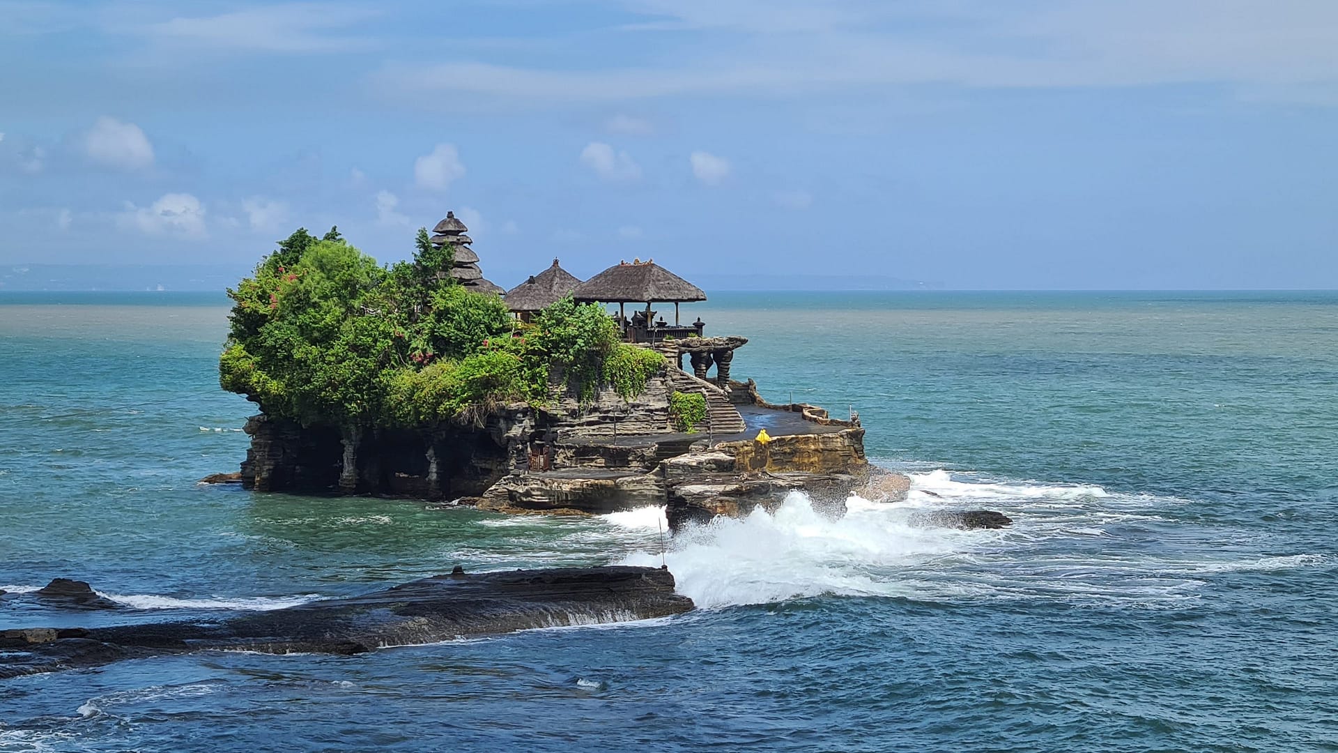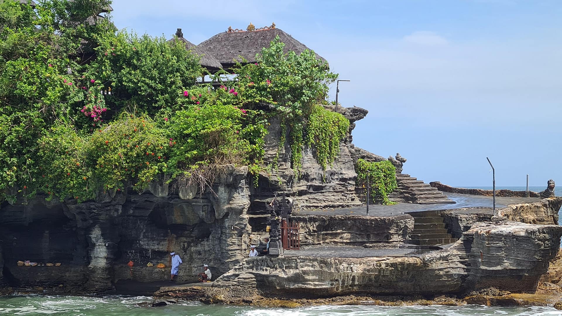 Etwa 40 Minuten von Seminyak entfernt liegt der berühmteste Tempel Balis. Der Meerestempel Tana Loth. Das Besondere dran ist, dass er auf einer Felsspitze im Meer gebaut wurde, die sich trockenen Fußes nur bei Ebbe erreichen lässt. Neben den Reisfeldern gilt dieser Ort als das beliebteste Postkartenmotiv der Insel. Entsprechend viele Händler haben ihre Stände vor den Eintrittstoren der Anlage aufgebaut. Es gibt dort auch einige Cafés und Restaurants, an denen man sich mit einem schönen Blick auf den Tempel stärken kann. Da (wie überall) die Touristen-Hotspots meist etwas teurer sind als an etwas abgelegeneren Orten, haben wir jedoch verzichtet hier zu essen.