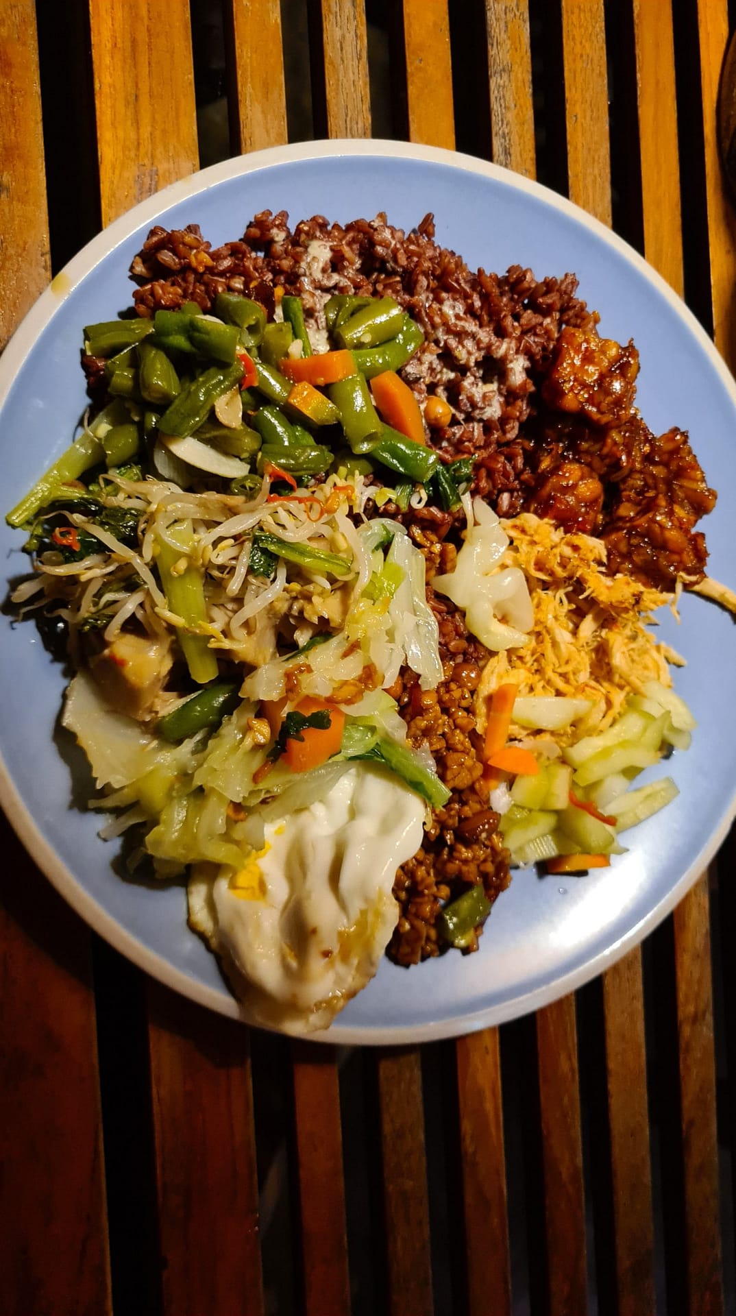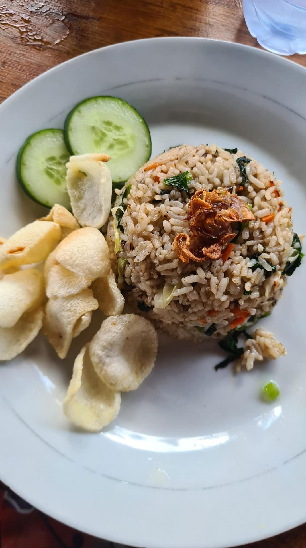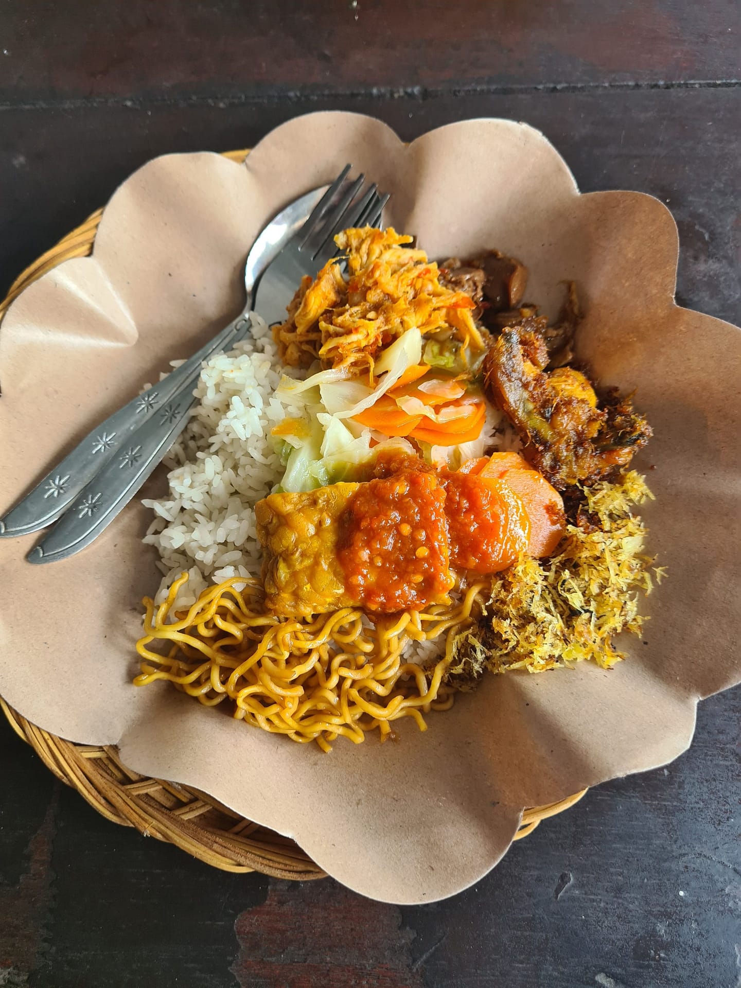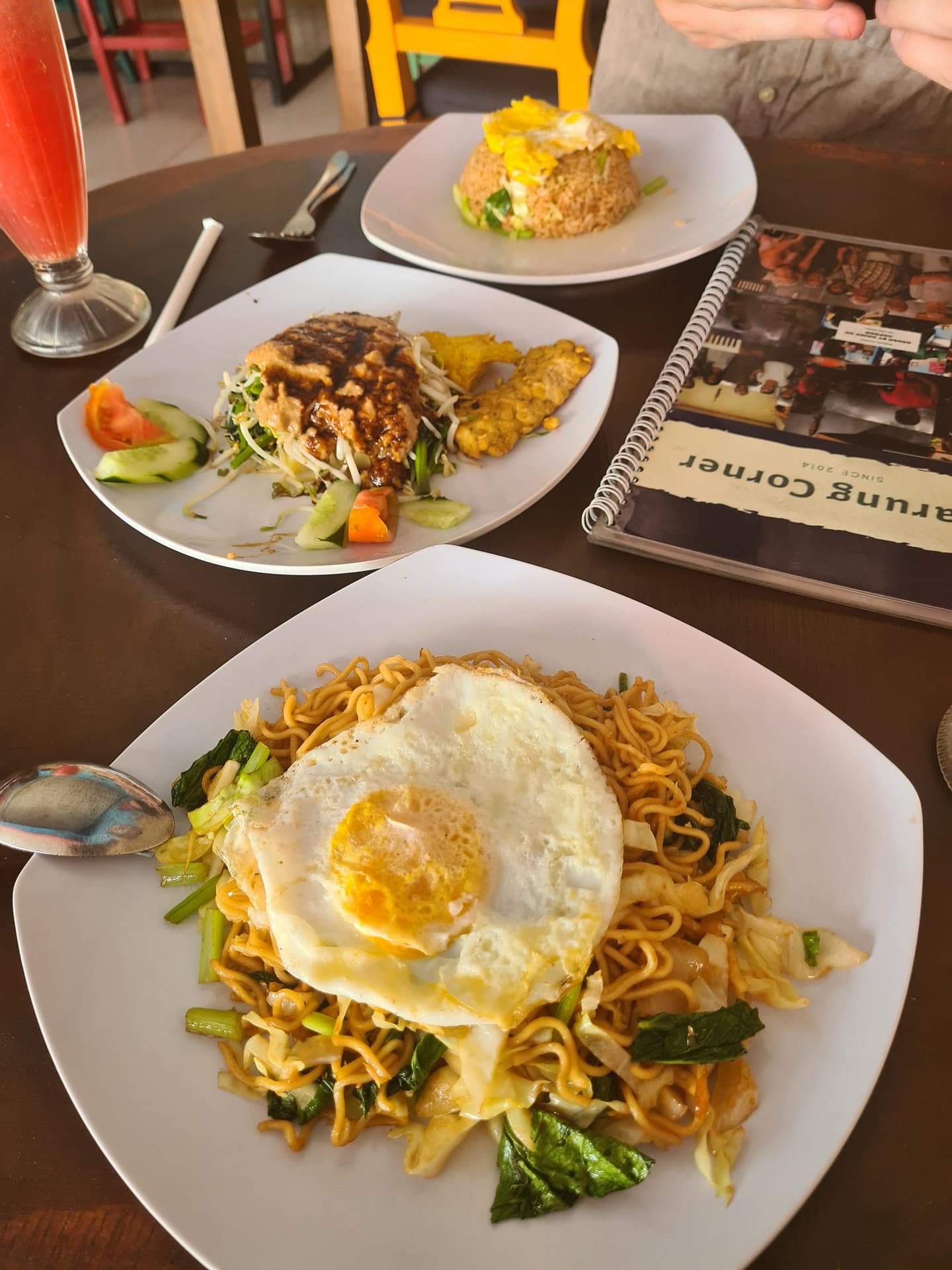 In der Nähe unserer Unterkunft Warung Wayan. Warungs werden hier die kleinen Restaurants an den Straßen genannt, die häufig Nasi Goreng bzw. Mie Goreng anbieten. Nasi bedeutet auf indonesisch „Reis“. Mie sind Nudeln und Goreng steht für gebraten. Eines von Lukas absoluten Lieblingsgerichten in Indonesien. Auch unbedingt probieren sollte man Nasi Campur, wobei Campur für „mischen“ steht. Dieses Gericht ist Reis mit verschiedenen Beilagen, die man dann zusammen mischen kann. In touristischeren Läden wird einem einfach ein Teller mit bereits zusammengestelltem Nasi Campur gebracht. In den kleinen Lokalen Warungs kann man aus einer Menge an verschiedenen Zutaten selbst wählen, was man auf dem Teller haben möchte.