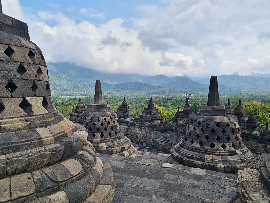 Direkt am ersten Tag mit fuhren wir mit unserem Roller eine gute Stunde außerhalb der Stadt zum Borobudur Tempel. Dieser ist die größte buddhistische Tempelanlage der Welt und UNESCO-Weltkulturerbe. Historisch betrachtet wurde der Tempel vermutlich zwischen 750 und 850 gebaut. Als sich das Machtzentrum Indonesiens verlagerte, geriet der Tempel zwischen dem 11. und 12. Jahrhundert in Vergessenheit. 1814 wurde der Borobudur wiederentdeckt und von der Vegetation und Vulkanasche befreit. Eine große Restaurierung fand von 1973 bis 1983 statt.