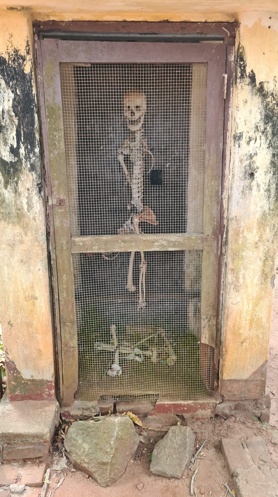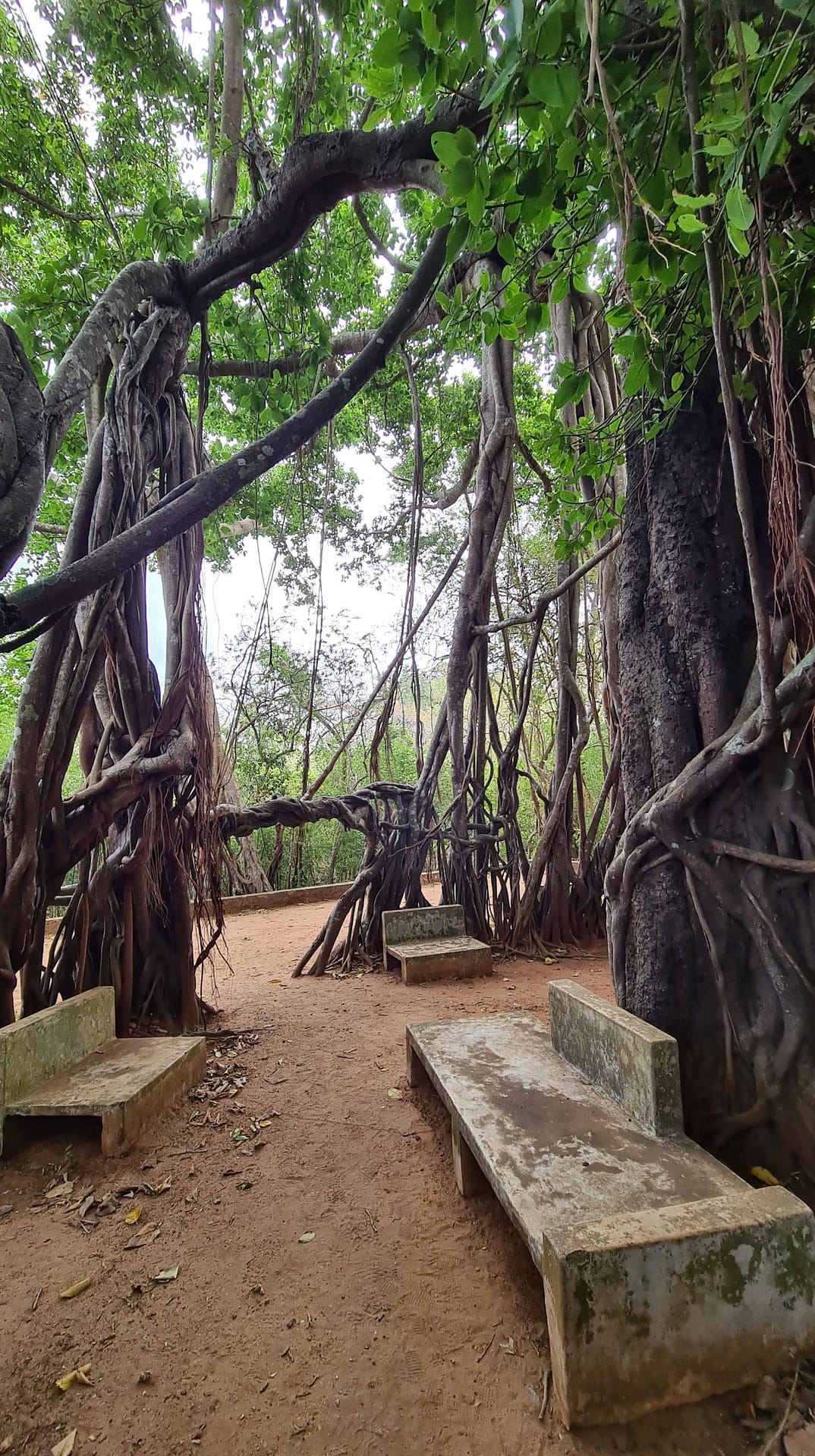 Ein weiteres Fundstück auf unserer Reise war der Old Banyan-Tree. Übersetzt eine Banyan-Feige oder auch Bengalische Feige. Ein gigantischer Baum, dessen Baumstammflechten sich verzweigten und eine interessante Struktur bildeten. Man konnte sogar in den Baum hineinlaufen. Dort gab es einige Sitzgelegenheiten aus Beton und war dort fast komplett vom Baum umschlossen. Wir waren alleine an diesem Ort. Seltsamerweise fanden wir dort auch eine Holzkiste mit einem aufrecht stehenden Skelett im Inneren. Einige Meter weiter, gab es einen buddhistischen Tempel, der ganz nett anzusehen war. Wir hätten uns dort nicht einfach hineingetraut, weil weit und breit kein Tourist zu sehen war. Trotzdem wurden wir von einem Mönch, der uns zufällig entgegenkam, eingeladen, uns den Ort etwas genauer anzusehen.