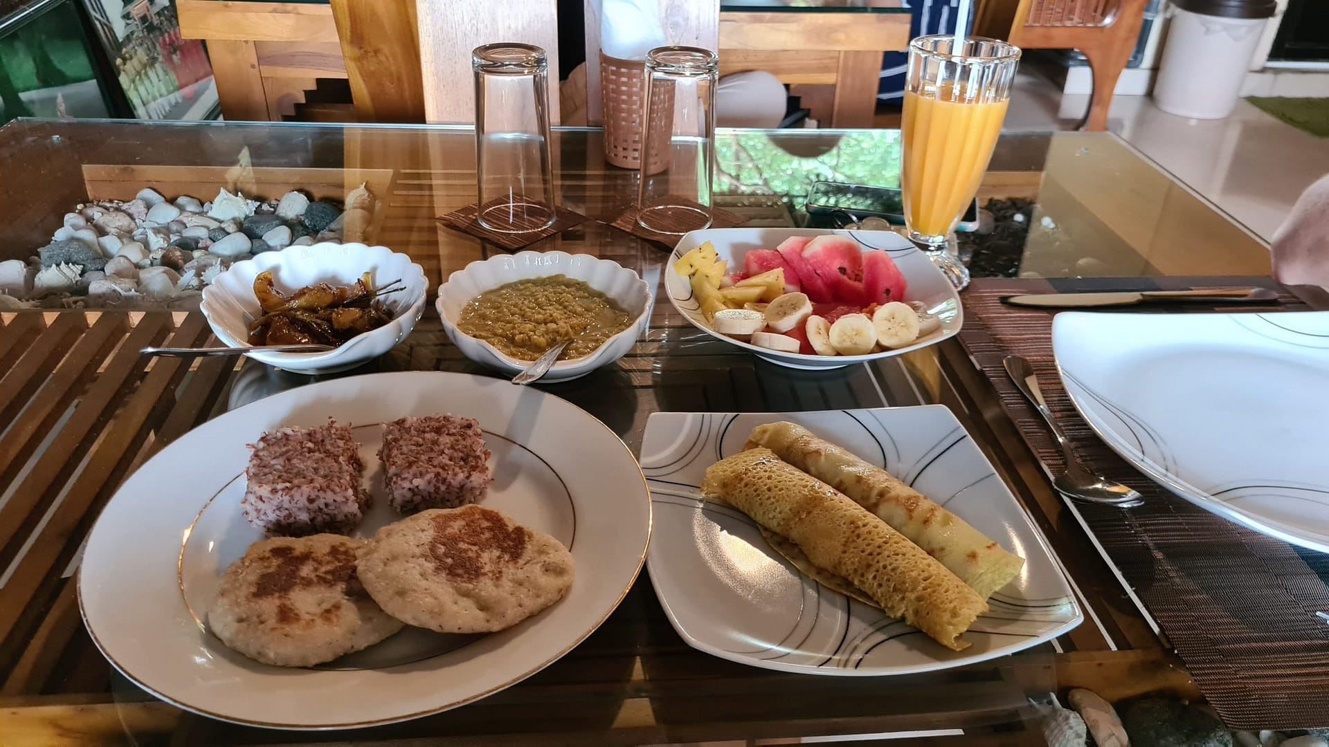 In unserer Unterkunft gab es praktischerweise ein hervorragendes Frühstück. Früchte, Dhal-Curry, frisches Brot, gefüllte Pfannkuchen und String Hoppers. Wir brauchten uns also nicht großartig um ein Frühstück zu kümmern.