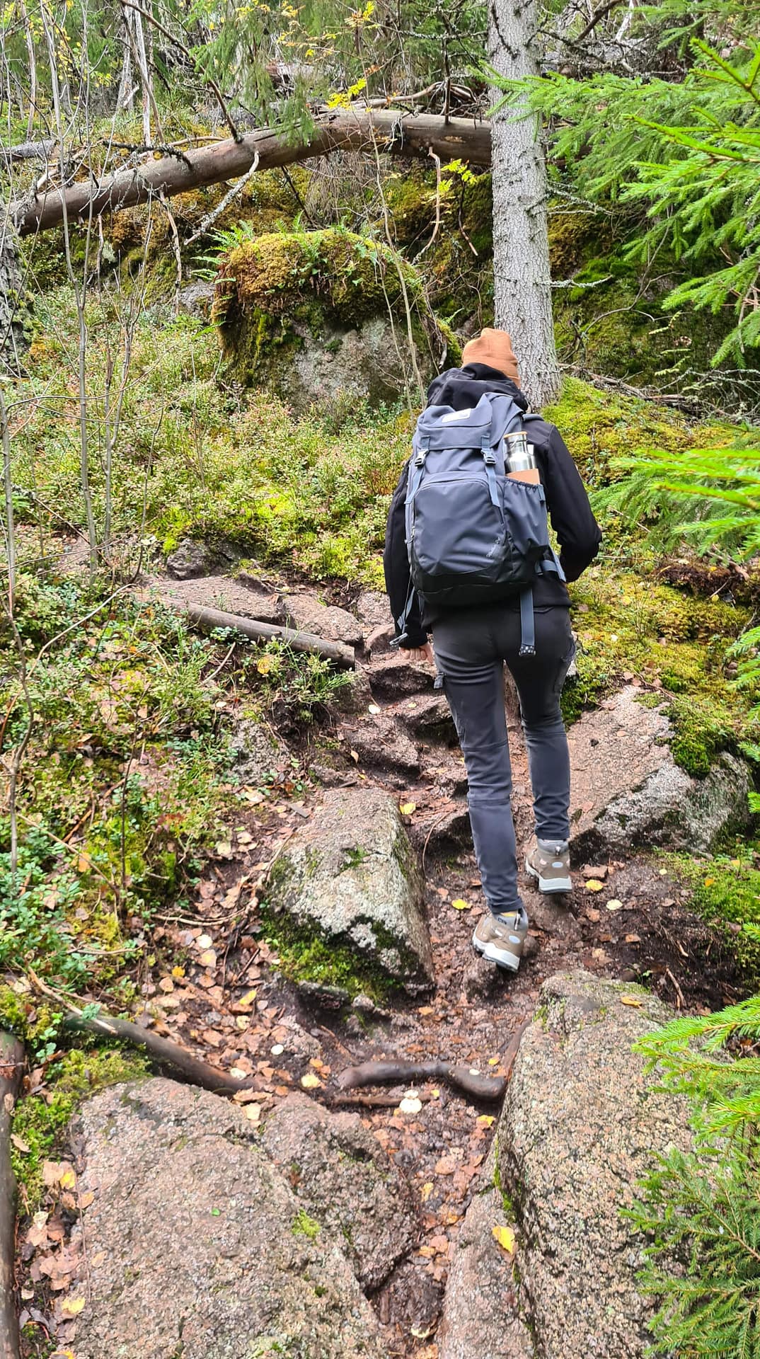 Wir begannen also die 4,6 Kilometer des Trollkyrka-Wanderwegs (Rot, auf der rechten Seite). Auch wenn der Weg mit etwa drei Stunden Dauer gekennzeichnet war, benötigten wir doch knapp vier Stunden. Klar machten wir einmal etwa 20 Minuten Pause, aber ein weiterer Grund war, dass es in den letzten Tagen viel regnete und wir häufig großen Wasserpfützen ausweichen oder drumherum klettern mussten und nicht einfach durchmarschieren konnten. Wir empfehlen dir daher zu dieser Jahreszeit unbedingt Wanderschuhe auf diesen Wegen!