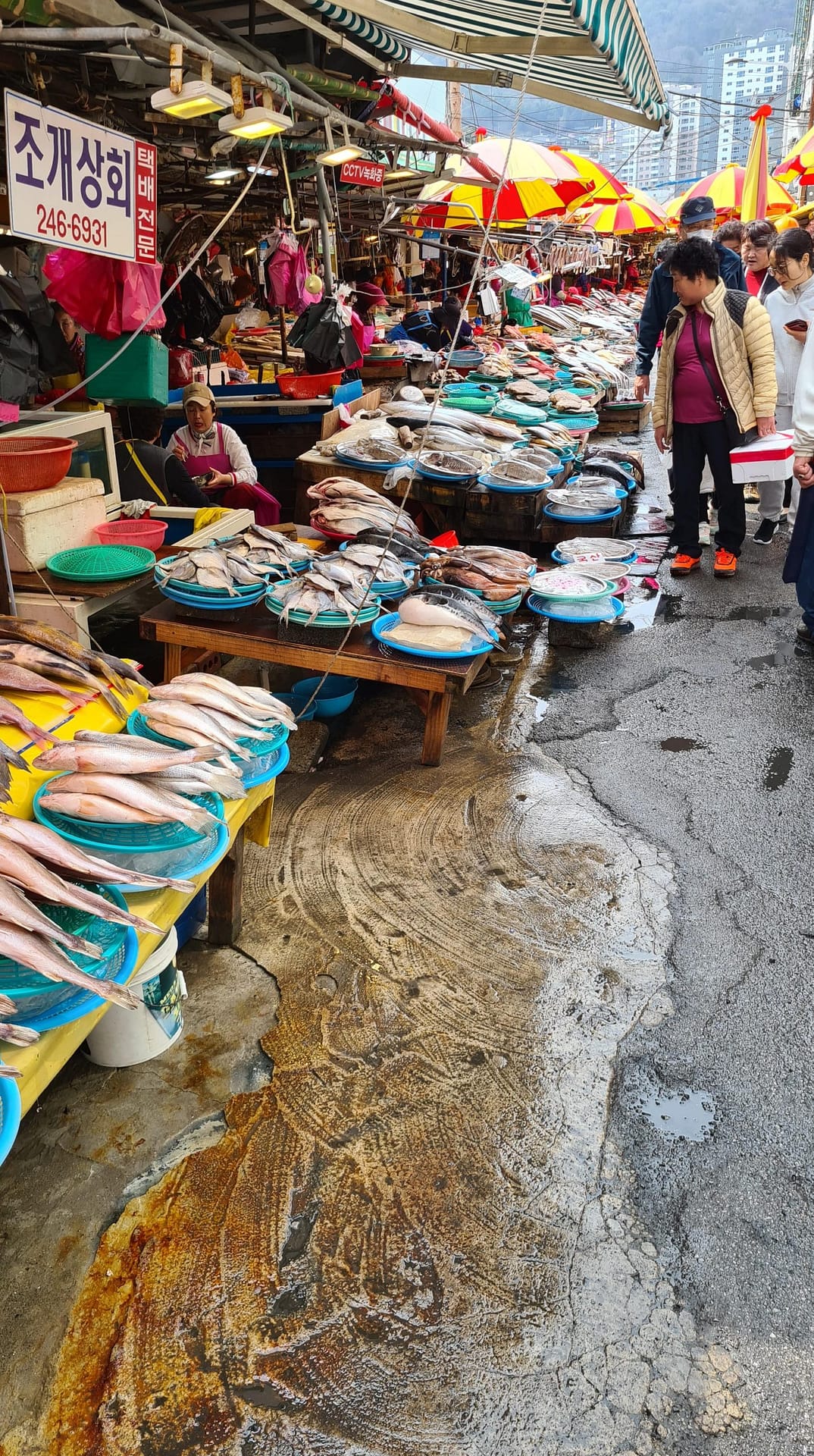 Der erste Eindruck war: Busan ist kompliziert. Klar, haben wir Seoul genau so beschrieben, aber tatsächlich war der Ersteindruck bei Busan derselbe. Da es hier ein ganz anderes Liniensystem für Straßenbahn und Metro gibt, mussten wir uns erst einmal zurechtfinden. Außerdem lag unsere Unterkunft etwas außerhalb der herkömmlichen Bahnlinien in Flughafennähe, daher konnten wir unsere Haltestelle auf dem Fahrplan auch zuerst nicht finden. Generell kann man aber sagen, hat es nach dieser Anfangshürde mit den öffentlichen Verkehrsmitteln in Busan besser geklappt als in Seoul. Auch in Busan hat es hin und wieder etwas streng gerochen. Das lag allerdings nicht wie in Seoul an den Streetfood-Ständen, sondern daran, dass es an zufälligen Orten in Busan -auch in der Innenstadt- eine offene Kanalisation gib (die Kanaldeckel sind zum Teil nur Gitter).