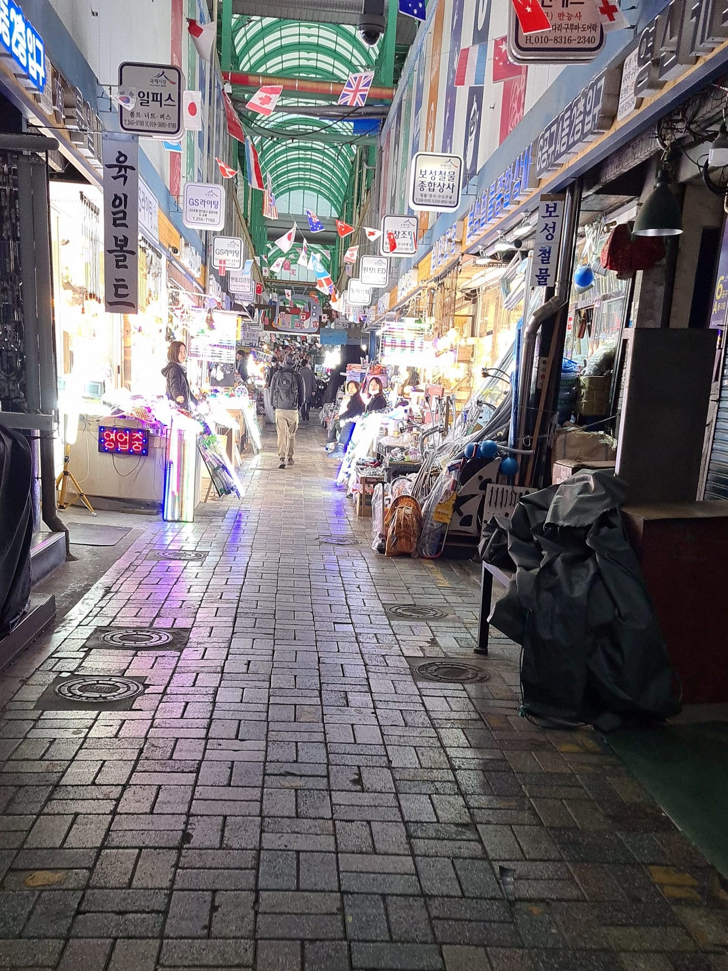 Außerdem gibt es dort den Gukje-Markt. Dieser zieht sich über einige Straßen und fühlt sich fast an wie ein eigenes kleines Viertel. Hier findet man von Elektronik über Wasserhähne, Ventilatoren, Klamotten, Taschen und Schuhe alles was man benötigt. Zwischenzeitlich mussten wir aufgrund eines Unwetters Unterschlupf in einem Café suchen, dass zum Glück auch sehr leckeren Kuchen im Angebot hatte.