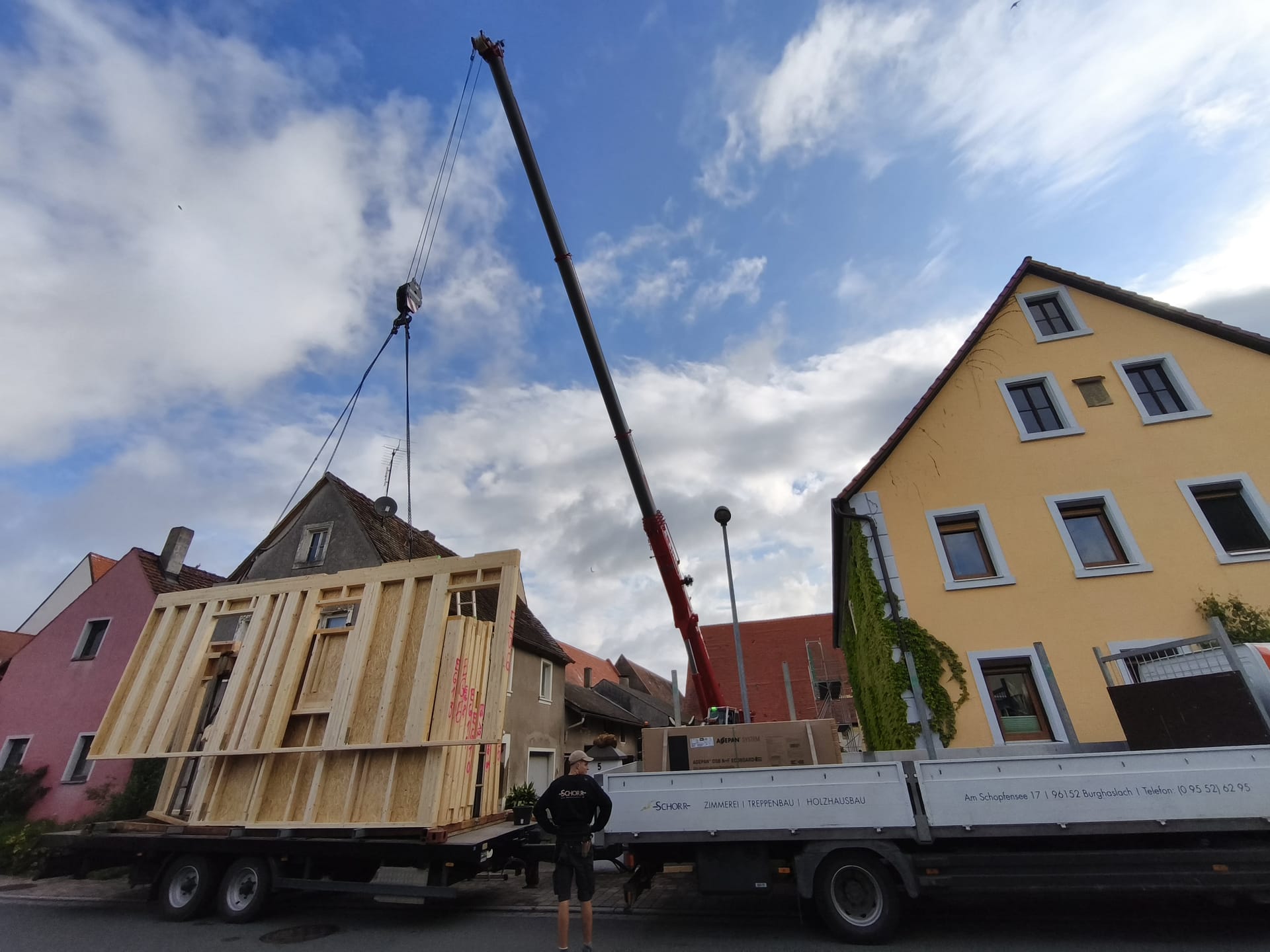 Letztendlich kam aber erst ein sehr großer 90-Tonnen-Kran angefahren und hinterher dann vier LKWs beladen mit den verschiedenen Hausmodulen.