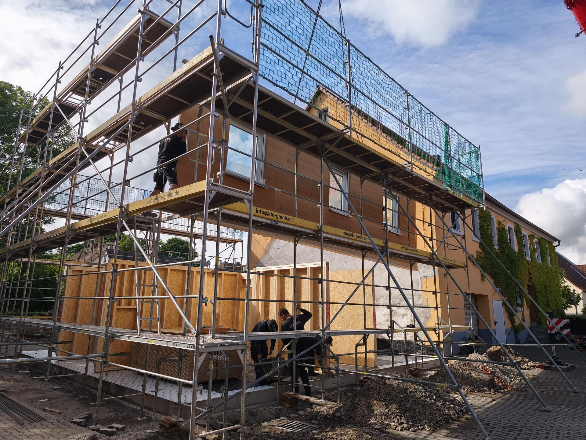 Vor der Mittagspause stand schon das Erdgeschoss, und die Decke wurde aufgesetzt. Fenster inklusive Rollokasten war überall schon verbaut. Das Wetter wurde gegen Mittag besser. Heißt, die Sonne kam raus. Wir haben eigentlich fast den ganzen Tag nur zugesehen, wie die Wand- und Deckenmodule des Hauses mit dem riesigen Kran von der Straße aus über mein Elternhaus in den hinteren Teil des Hofes gehoben und wurden. Sonnenbrand und steifer Nacken inklusive.
