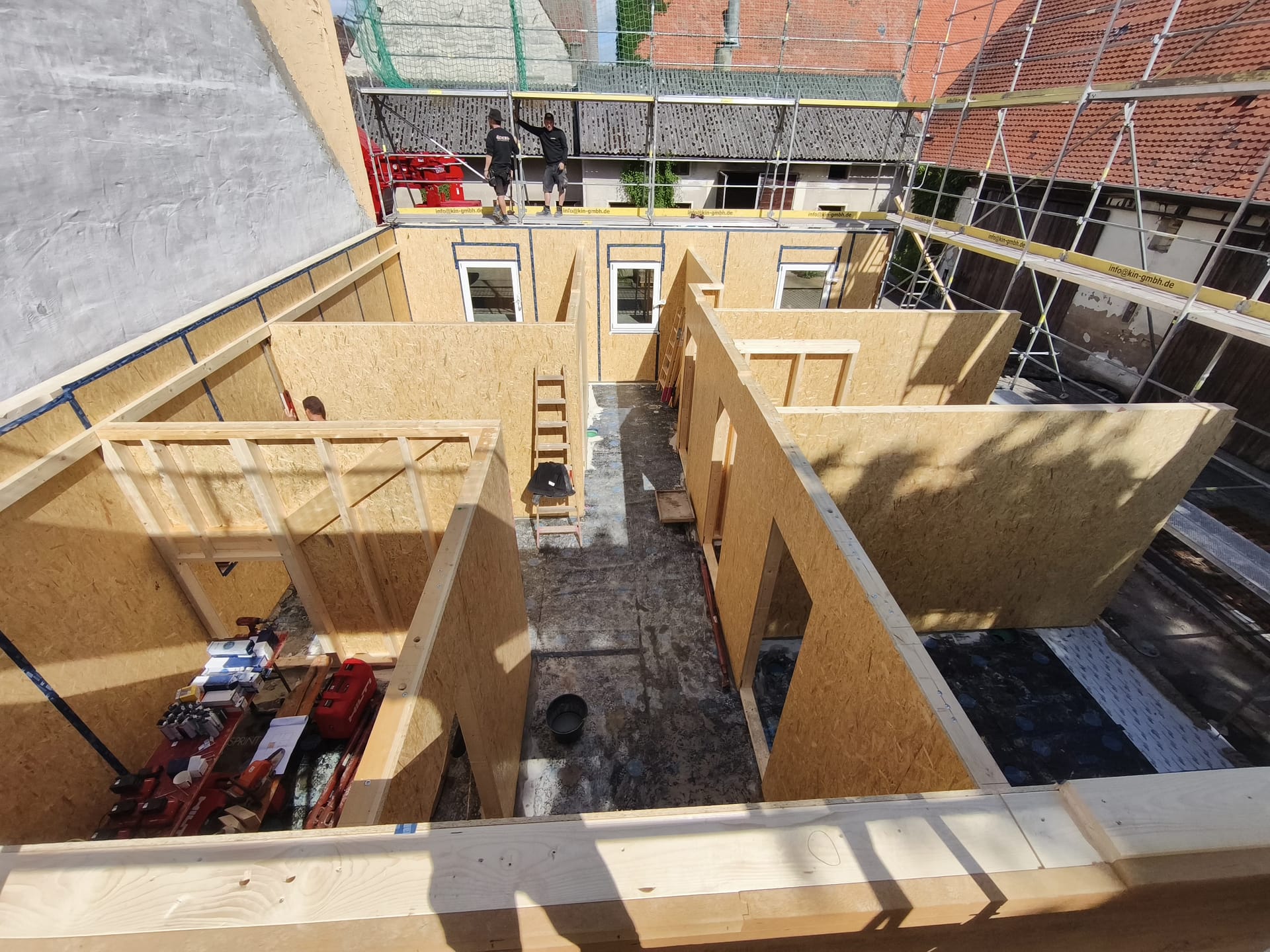 Vor der Mittagspause stand schon das Erdgeschoss, und die Decke wurde aufgesetzt. Fenster inklusive Rollokasten war überall schon verbaut. Das Wetter wurde gegen Mittag besser. Heißt, die Sonne kam raus. Wir haben eigentlich fast den ganzen Tag nur zugesehen, wie die Wand- und Deckenmodule des Hauses mit dem riesigen Kran von der Straße aus über mein Elternhaus in den hinteren Teil des Hofes gehoben und wurden. Sonnenbrand und steifer Nacken inklusive.