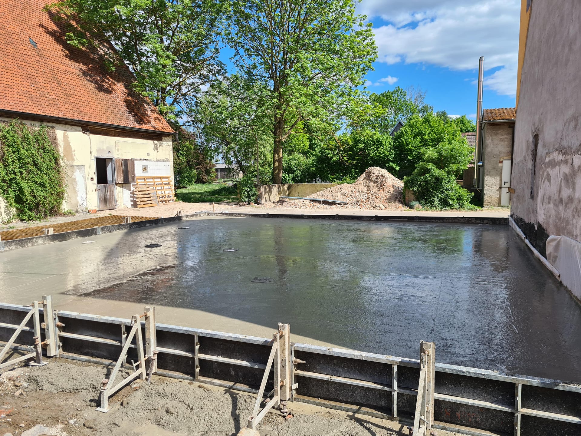 Hui, der erste Bauabschnitt hat schon einmal funktioniert. Zwischenzeitlich hat es so ausgesehen, als würden wir den Stelltermin für das Haus nicht rechtzeitig schaffen, da der Bauantrag recht lange dauerte und die gesamte Baulandschaft mittlerweile wieder deutlich besser läuft als letztes Jahr. Letztendlich haben die Bauarbeiter sich sehr bemüht und in knapp zwei Wochen die Bodenplatte gegossen. Damit waren wir wieder im Zeitplan. Vielen Dank dafür 🙂