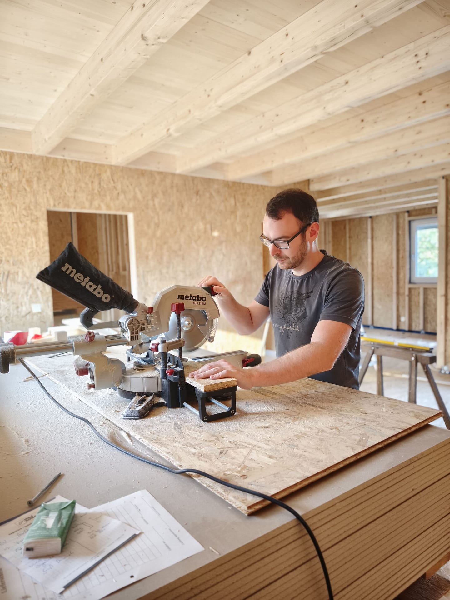 Wir haben noch ein Stromkabel unterirdisch am Haus entlang verlegt. Außerdem haben wir Zierleisten im Obergeschoss an die Wand angebracht, sodass es aussieht, als gehen die Balken durchgängig entlang der Raumwände. Zudem mussten wir uns etwas intensiver mit einigen Einrichtungsthemen beschäftigen. So haben wir zum Beispiel lange überlegt, welche Ablufthaube in die Küche kommt und welche Art von Boden wir am Ende im Haus haben möchten.