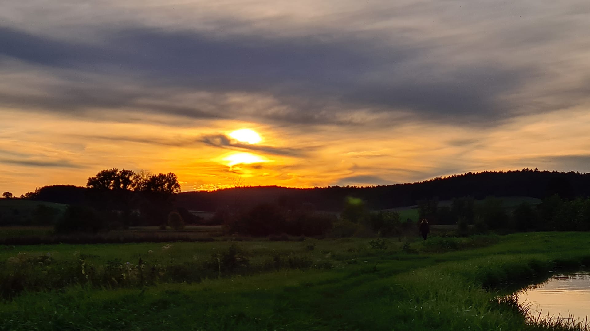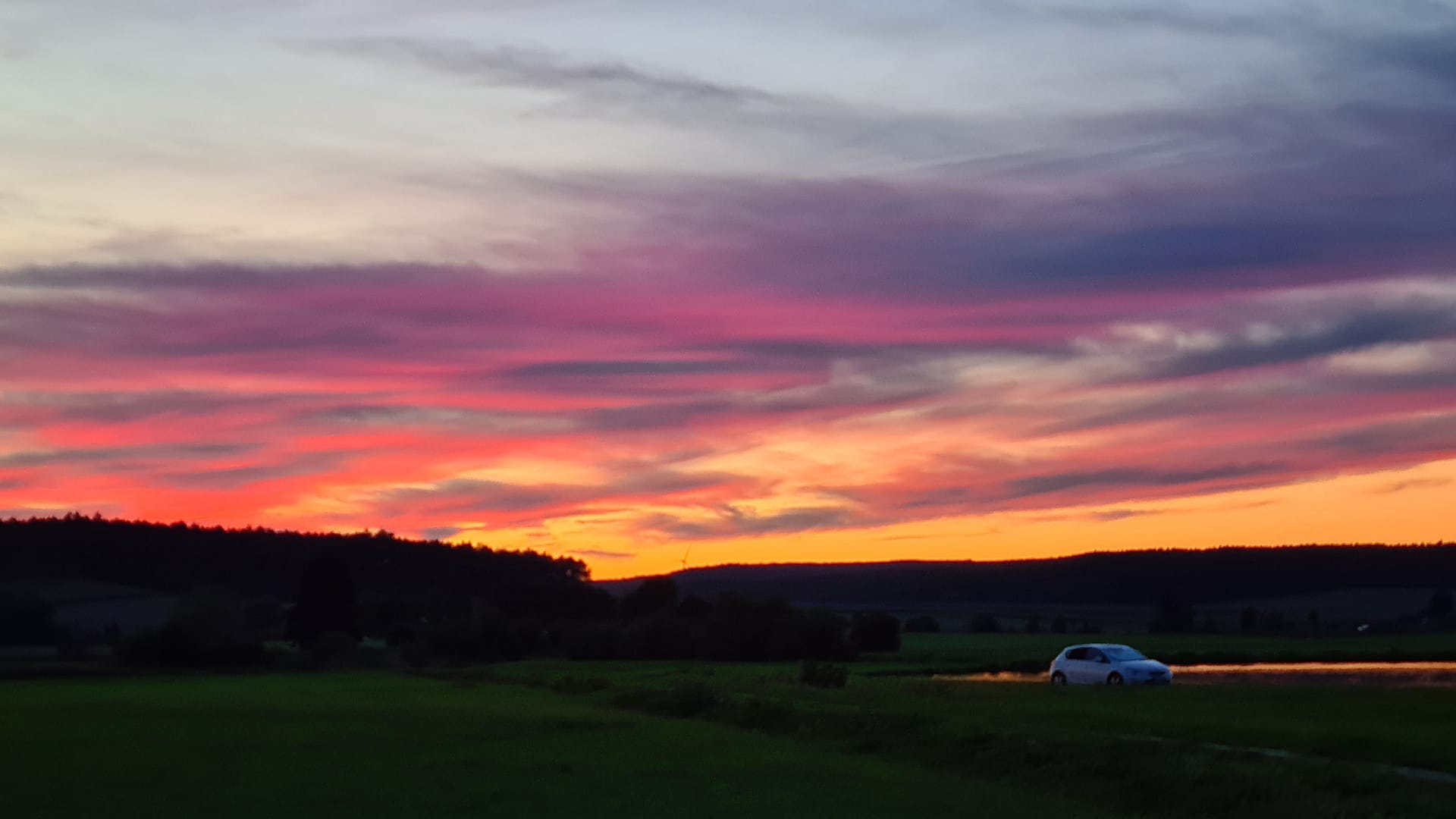 Natürlich haben wir das auch getestet und an einem Weiher in der Nähe die Nacht verbracht. Nachteil ist, dass Lukas etwas zu lang für das Auto ist. Man muss also die Vordersitze ganz nach umklappen, damit er einigermaßen ausgestreckt hinten im Auto liegen kann. Theoretisch hat alles auch so funktioniert, wie wir es uns dachten. Problematisch wird es bei einem Trip mit dem Auto nur, wenn es einmal regnen sollte. Um alles zum Schlafen vorzubereiten, müssen wir nämlich jedes Mal aussteigen. Und wenn wir uns dann wieder ins Auto schwingen, fehlt uns ein wenig Platz, um nicht alles nass zu machen bzw. um sich umzuziehen. Wir übernachteten also eine Nacht im Auto, aßen Tütensuppe und machten eine kleine Nachtwanderung. Das war ein sehr schönes kleines Abenteuer. Trotzdem dachten wir ursprünglich, dass wir zwei bis vier Wochen so unterwegs sein könnten. Diese Nacht hat uns doch eines Besseren belehrt und wir schätzen, dass man (bei gutem Wetter!) eine Woche darin gut übernachten kann. Allerdings auch nur, wenn die Temperaturen stimmen. Wir schliefen Anfang September im Auto, da hatte es Nachts noch etwa 15 Grad. Das war mit Schlafsack und Decke in Ordnung. Ende September, Anfang Oktober, wenn die Temperaturen in der Nacht unter 10 Grad fallen, wird es wesentlich unangenehmer. Für dieses Jahr wird es also schwierig, das Auto zu nutzen. Vielleicht bietet sich nächstes Jahr die Gelegenheit. Trotzdem hatten wir ein kleines, spannendes Abenteuer mit einem tollen Sonnenuntergang, der den anderen auf unserer Reise in nichts nachstand.