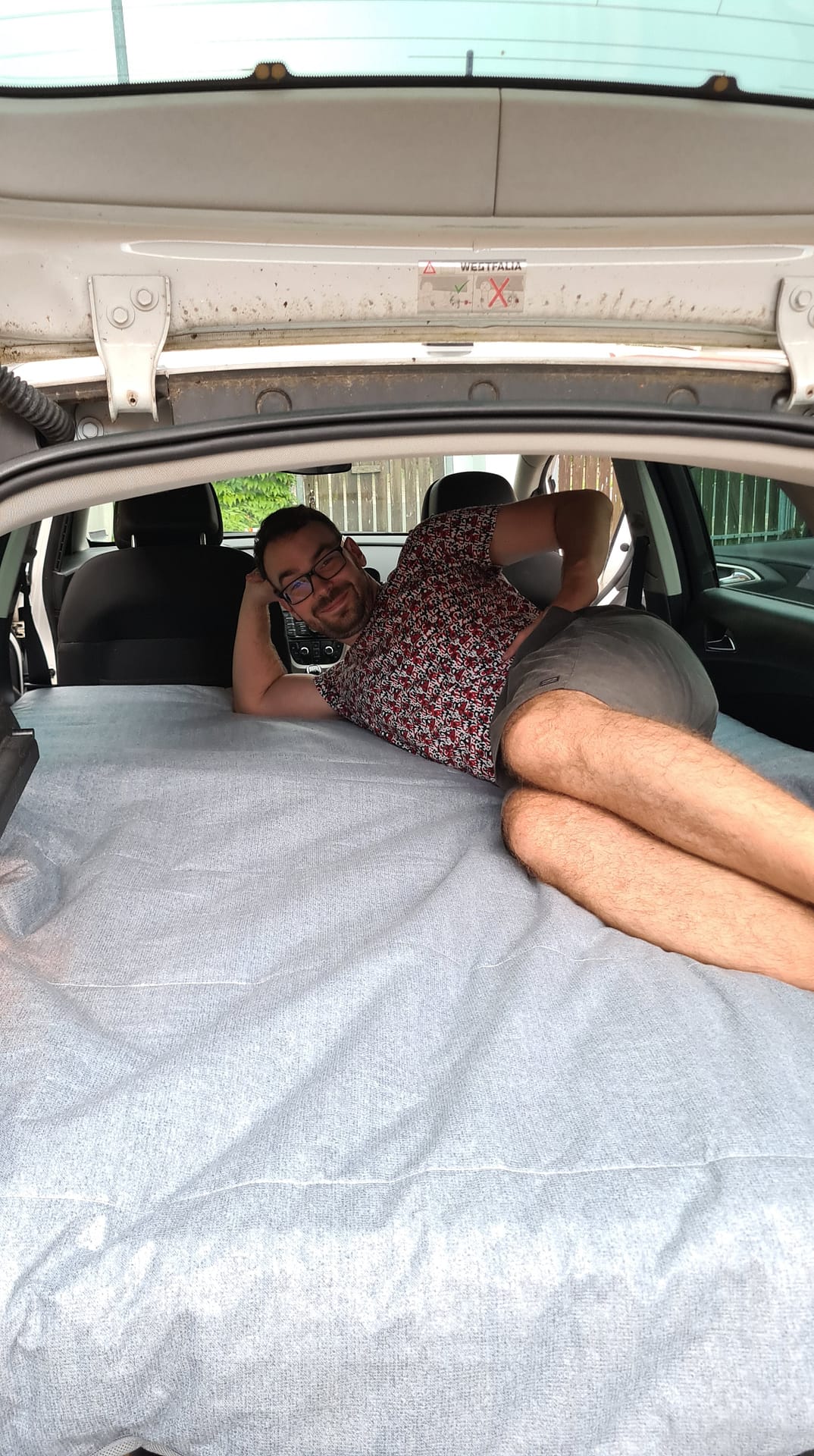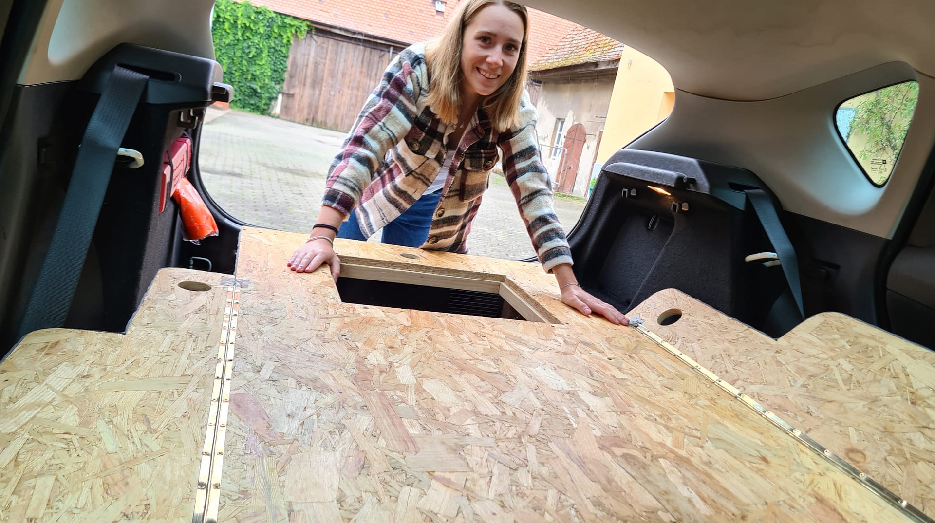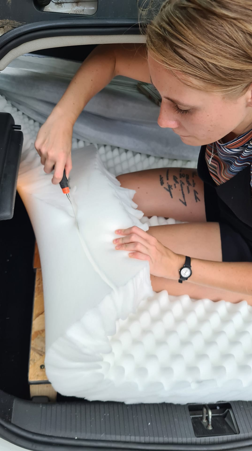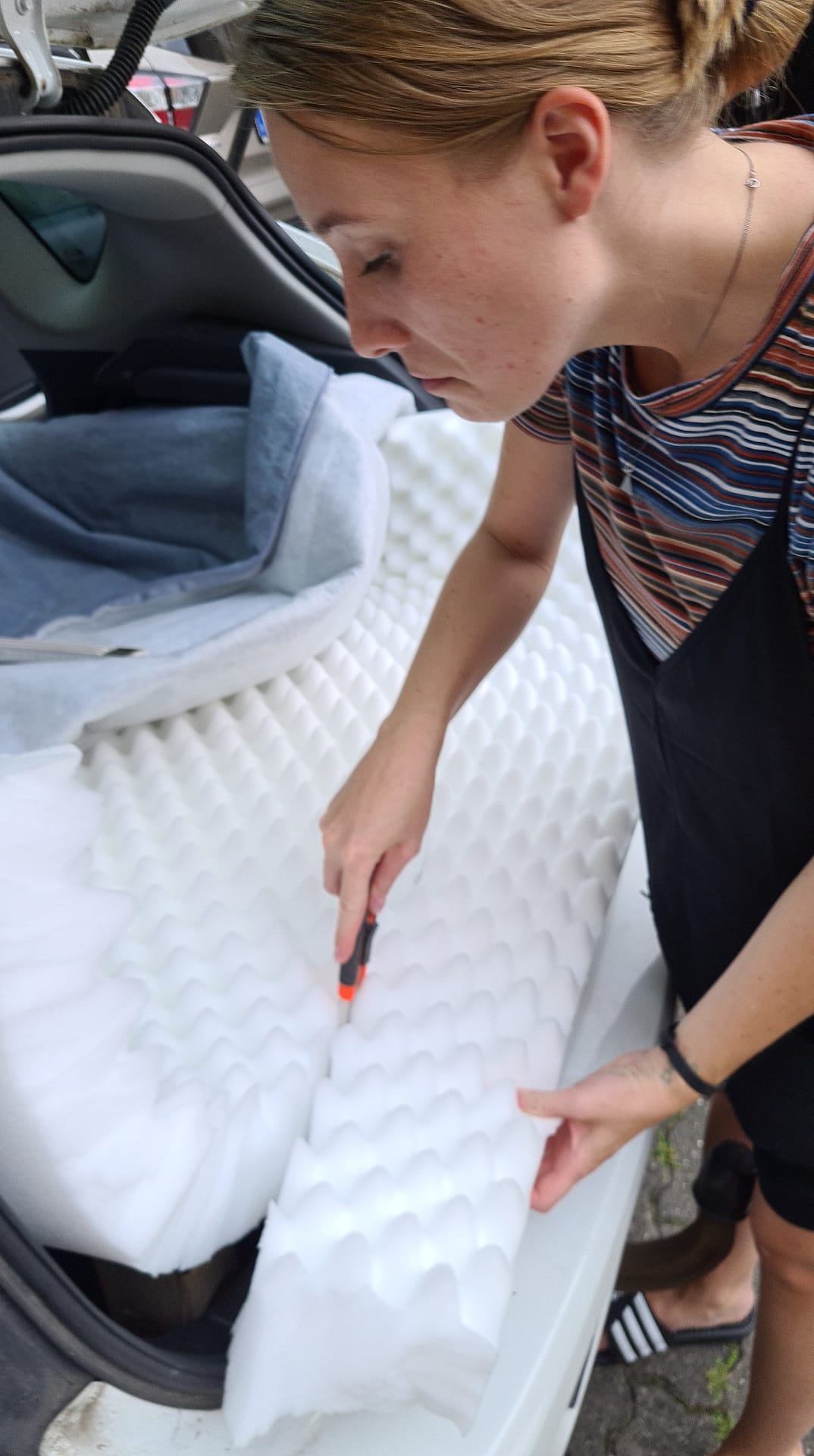 Die Idee kam eigentlich daher, dass Lukas mit dem Privatkauf eines neuen (gebrauchten) Autos eine Ablagefläche mit Stauraum darunter aus Pressspanplatten gekauft hat. Der vorherige Besitzer hat sie nicht mehr gebraucht und hätte sie dann einfach weggeworfen. Leider war Lukas‘ Auto etwas niedrig, um zu zweit darin zu schlafen und hat keine Hintertüren, was den Einstieg etwas kompliziert macht. Da Julia zufällig ein Nachfolgemodell desselben Typs hat, konnten wir mit relativ wenig Anpassungen die Ablagefläche für ihr Auto abstimmen. So hat uns das alles nicht viel Zeit gekostet. Wir haben außerdem noch eine Schaumstoffmatratze für 50 Euro bei IKEA gekauft, die wir passend zurechtgeschnitten haben. Campingausrüstung hatten wir fast komplett beisammen. Damit es einigermaßen Blickdicht ist, haben wir bei Ikea einen günstigen Vorhang gekauft, der komplett abdunkelt. Julia hat dann einen Klettverschluss angenäht. Die Gegenstücke haben wir im Auto an die Scheiben des Autos geklebt. Für kleine Seitenfenster haben wir einfach Pappe zurechtgeschnitten. Für die Frontscheibe haben wir einen Sonnenschutz besorgt, den man von Innen befestigen kann. Die Nächste Galerie zeigt, wie wir Julias Auto vorbereitet haben.
