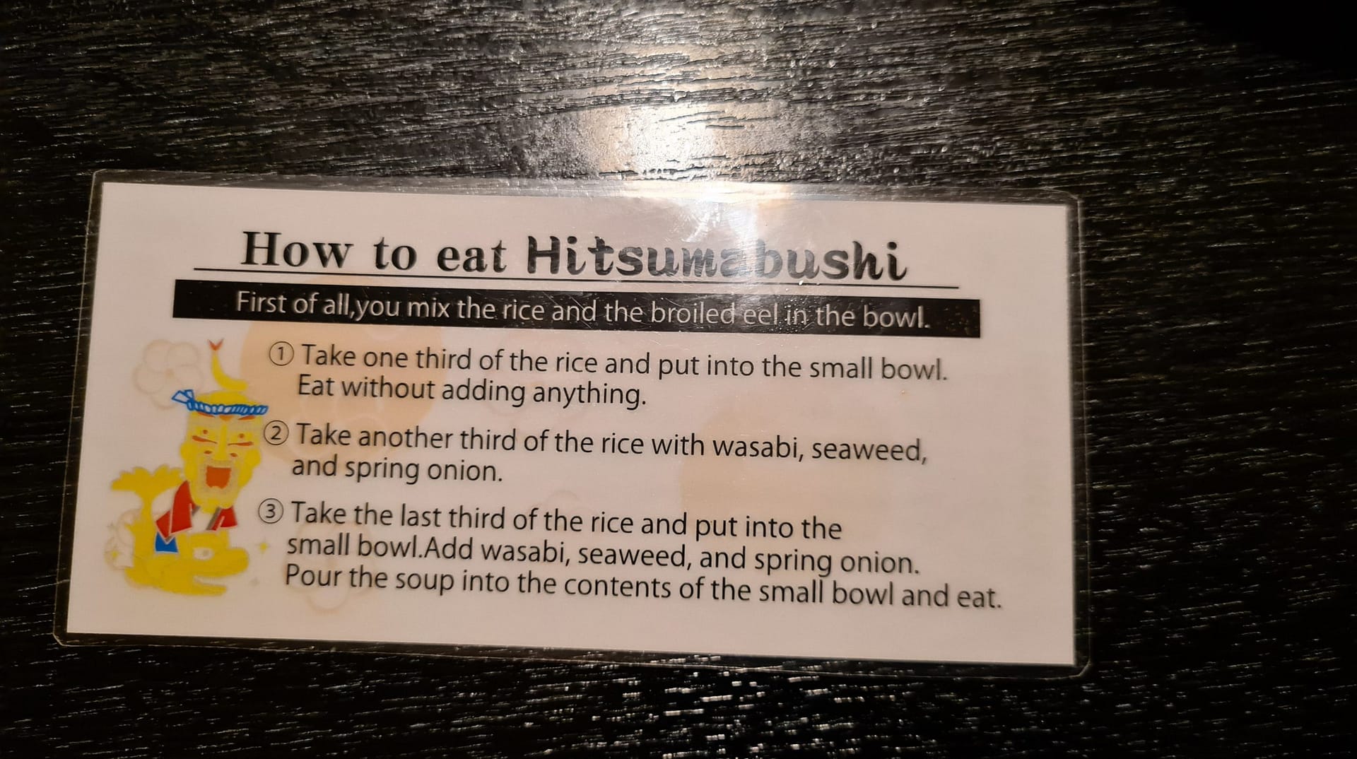 Wenn sich Julia das Essen aussuchen konnte, gingen wir eigentlich fast immer Ramen essen. Lukas wollte aber auch unbedingt einmal ein lokales Gericht aus Nagoya versuchen. Daher gingen wir am nächsten Tag in eine traditionelle Gaststätte und wir versuchten Hitsumabushi. In der Gaststätte wurde man gefragt, ob man in den Raucher oder Nichtraucherbereich möchte. Dann wurden wir zu einem niedrigen Tisch geführt und saßen auf dem Boden. Hitsumabushi ist ein gegrillter und marinierter Süßwasseraal auf Reis, den man in drei Stufen verspeist. Fast wie ein kleines drei-Gänge-Menü.