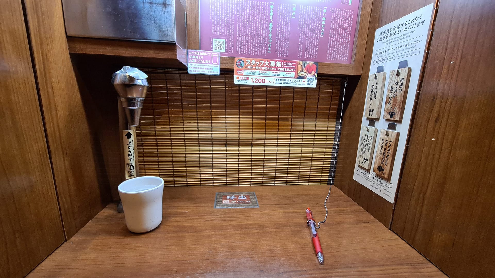 Eine besondere Erfahrung war es auch, Ichiran zu besuchen. Diese Ladenkette gibt es häufiger in Japans Großstädten und das Besondere ist, dass man hier in Ruhe essen kann, ohne ein Wort zu sprechen (sofern man das möchte). Bestellt wird über einen Automaten am Eingang. Eine elektronische Anzeige verrät einem, wenn Sitze frei sind. Dann sitzt man an einem langen Tresen mit eigenem Zapfhahn für stilles Wasser (andere Getränke kann man sich mit seinen Ramen am Eingang bestellen). Links und rechts von einem befinden sich Sichtschirme. Neben dem Sichtschirm hängen einige hölzerne Textsteine, die man bei Bedarf dem Personal zeigen kann, damit nicht gesprochen werden muss. Dann wird eine Art Rollo auf der anderen Seite des Tresens hochgezogen und man gibt dem Personal den Zettel mit der Bestellung aus dem Automaten. In wenigen Minuten steht das gewünschte Gericht vor einem und der Rollo wird wieder hinuntergelassen. Die Ramen waren sehr gut und bei Bedarf kann man auch den seitlichen Sichtschutz einklappen, um sich leise mit seinem Nachbarn zu unterhalten. Generell war das jedoch eine ganz besondere Erfahrung für uns, da es einmal etwas komplett anderes ist als gewöhnlich.