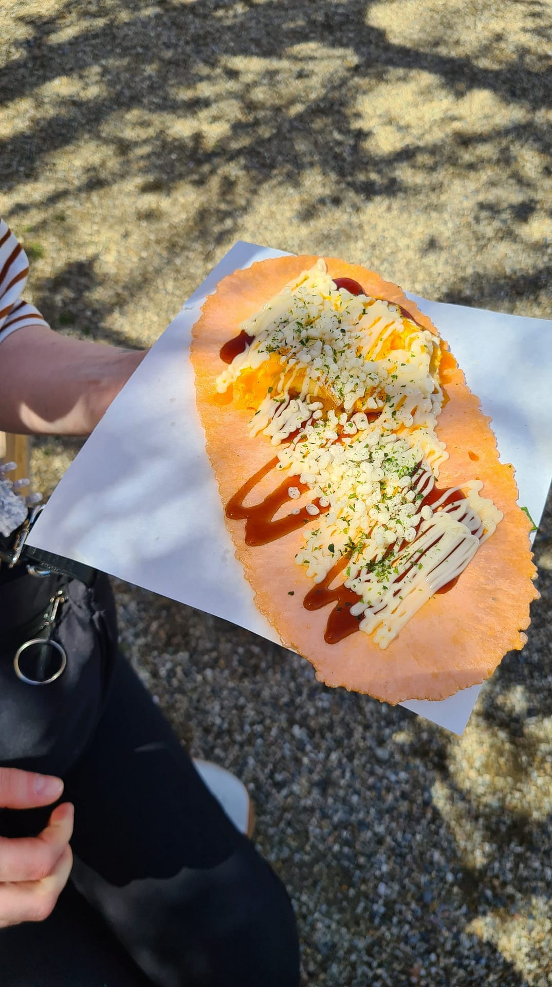 Praktischerweise fand vor dem Nagoya Castle eine Art Festival statt, an dessen Essensständen wir uns mit einem Okonomiyaki-Spieß und einem riesigen Shrimp-Cracker mit Ei, Käse und ein paar Soßen (leider haben wir den Namen vergessen) versorgt haben.