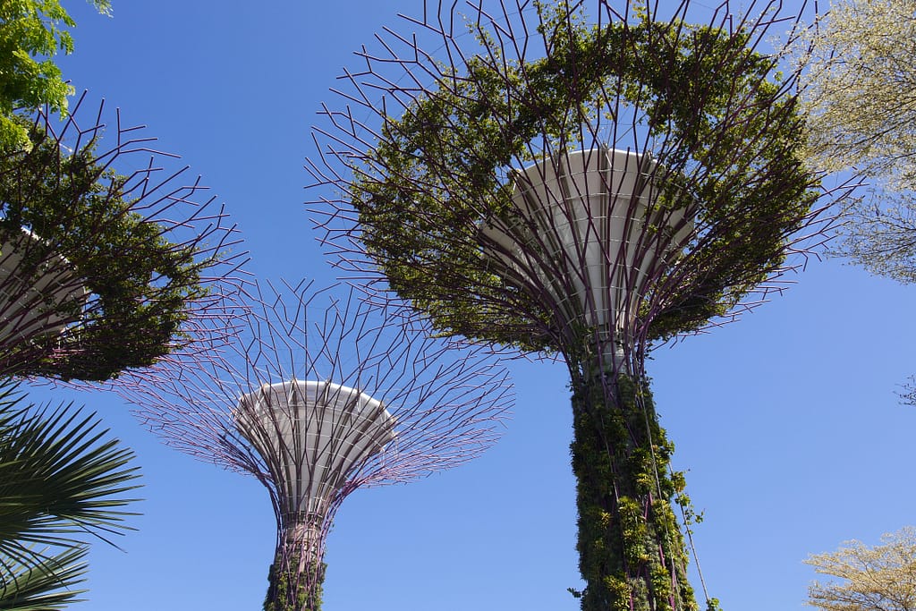 Natürlich sind auch Gärten in einer der grünsten Städte der Welt eine großartige Sehenswürdigkeit. Die Gardens by the Bay bieten einen großen, frei zugänglichen Bereich und einige Abschnitte, für die man Eintrittskarten benötigt. Julia zahlte etwas extra, um auf den Skyway der Supertrees zu gelangen. Lukas blieb ganz am Boden. Die Supertrees sind künstliche Bäume, die zum Teil über Solarzellen zur Stromversorgung des Parks beitragen oder auch mit einem Filtersystem für die Gewächshäuser ausgestattet sind.