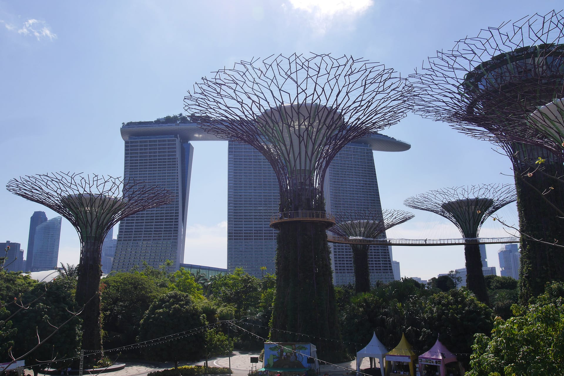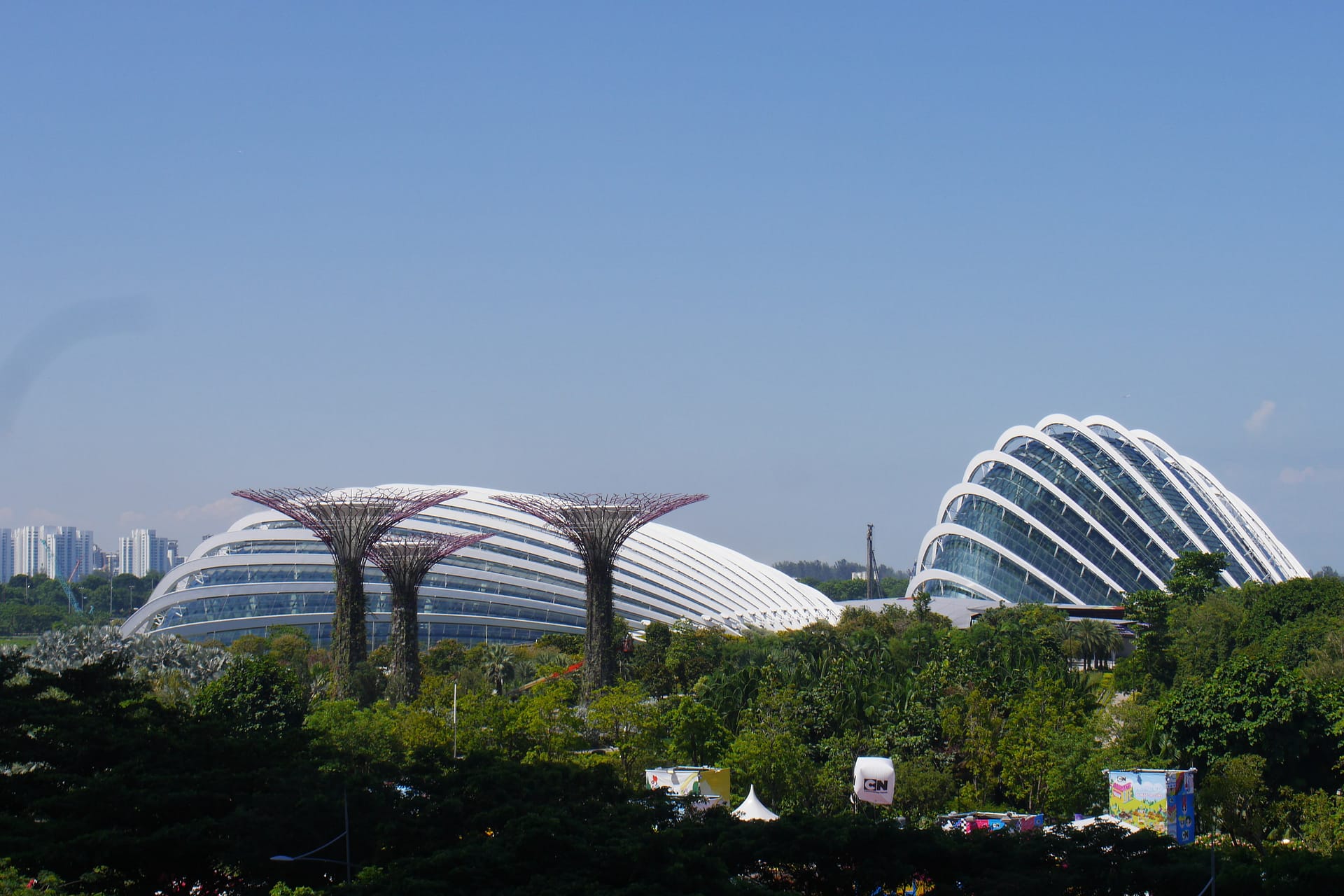Natürlich sind auch Gärten in einer der grünsten Städte der Welt eine großartige Sehenswürdigkeit. Die Gardens by the Bay bieten einen großen, frei zugänglichen Bereich und einige Abschnitte, für die man Eintrittskarten benötigt. Julia zahlte etwas extra, um auf den Skyway der Supertrees zu gelangen. Lukas blieb ganz am Boden. Die Supertrees sind künstliche Bäume, die zum Teil über Solarzellen zur Stromversorgung des Parks beitragen oder auch mit einem Filtersystem für die Gewächshäuser ausgestattet sind.