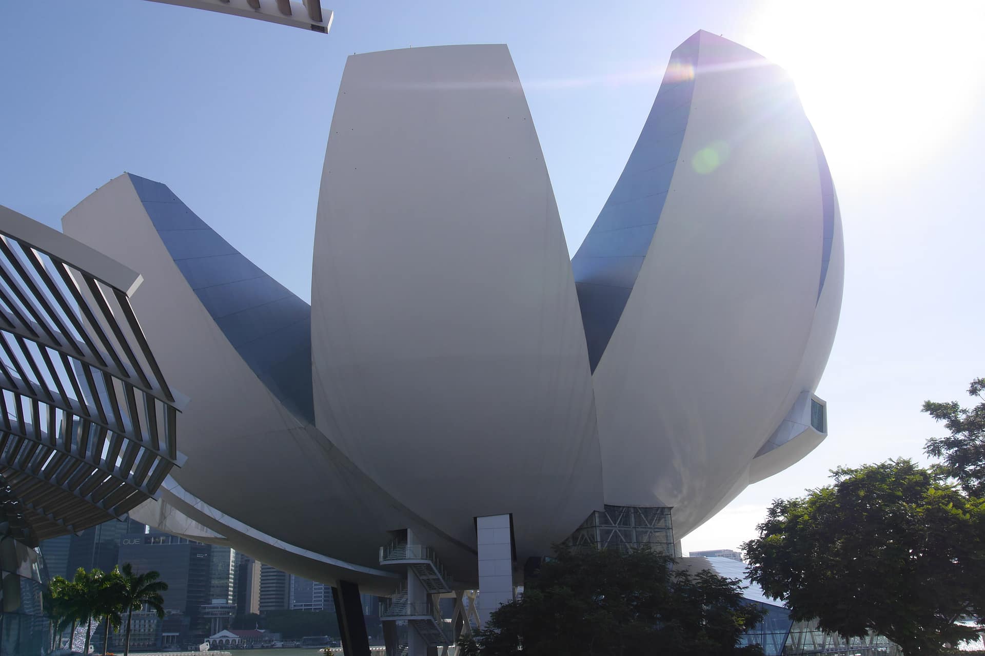 Ebenfalls ein Gebäude mit auffälliger Architektur ist das Science Art Museum neben dem Marina Bay Sands. Es hat die Form einer Lotosblüte und bietet vielfältige Wanderausstellungen berühmter Künstler. Lukas stand davor und war in der zugehörigen „Red Dot Designausstellung“ nebenan, aber schaffte es aus zeitlichen Gründen leider nicht, hineinzugehen. Aber bereits von außen ist es ein beeindruckendes Bauwerk, welches einen schönen Blick auf die Wolkenkratzer und Hochhäuser auf der anderen Seite der Bay bietet.