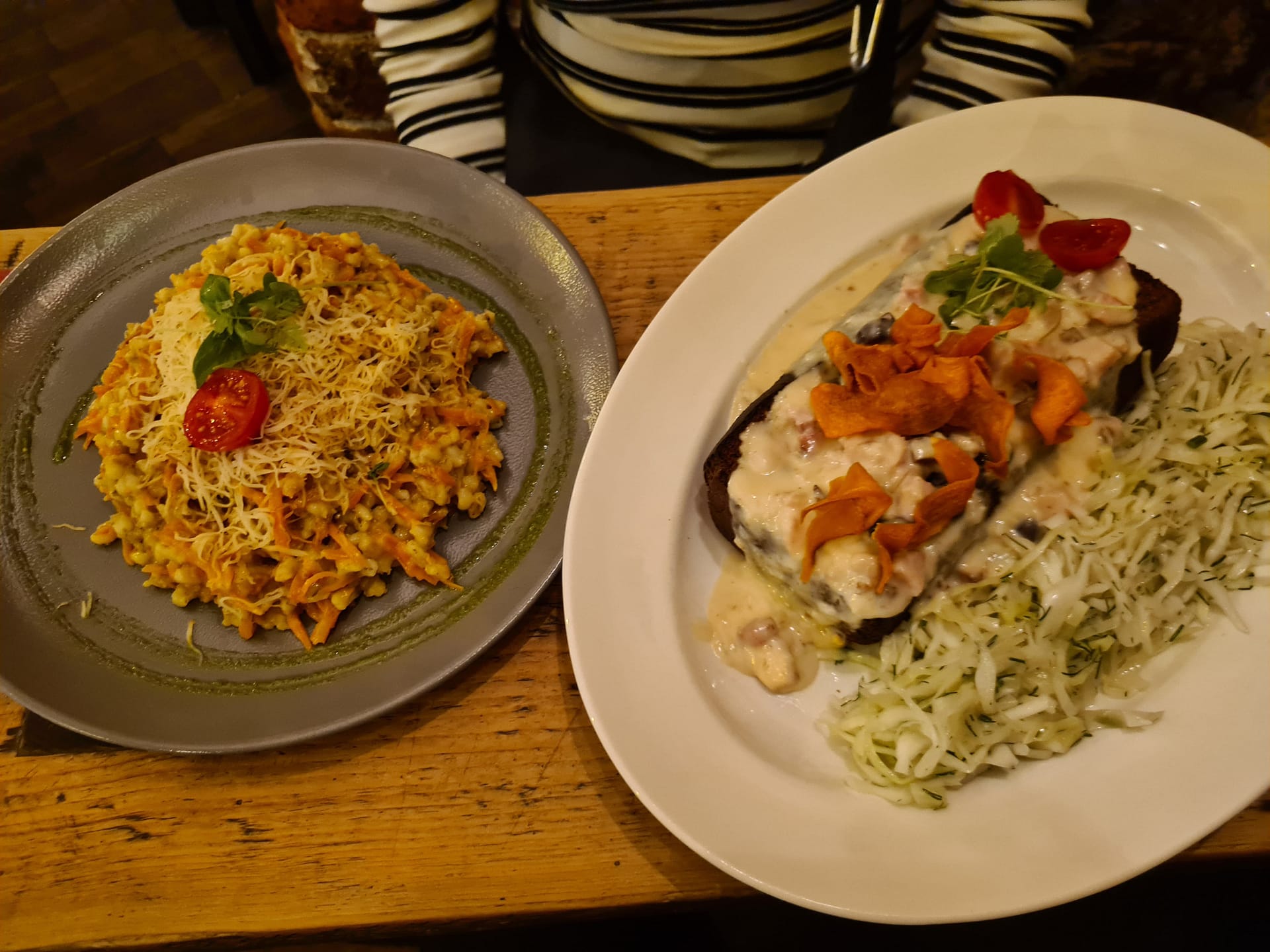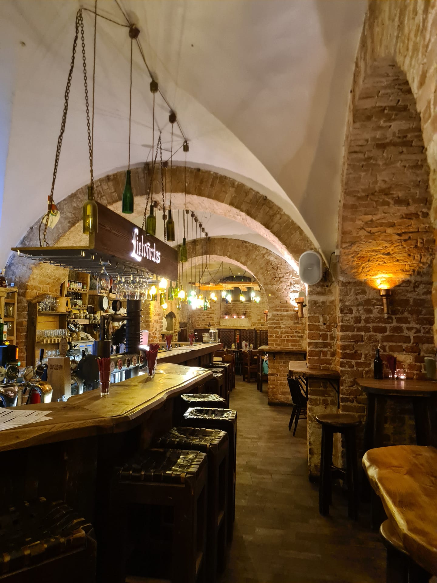 Abends ging es in den Folkklubs Ala Pagrabs. Hier geht es eine steile Treppe in ein riesiges Kellergewölbe hinunter. Ab 20 Uhr gibt es fast täglich Live-Musik und die Essensportionen waren sehr groß. Preis-Leistung hat hier auf jeden Fall gestimmt. Das Essen war ausgezeichnet. Julia hatte eine Art Risotto mit Karotten und Lukas hat die vegetarische Version der schwarzen Erbsen von gestern ausprobiert. Auch ohne Fleisch hat es sehr gut geschmeckt. Interessant war hier, dass Lukas‘ Gericht in einem kleinen, halben Brotlaib serviert wurde. Ähnlich wie die Brotsuppe in Prag. Wir haben an anderen Tischen gesehen, dass mehrere Gerichte in einem ausgehöhlten Brotlaib serviert wurden.