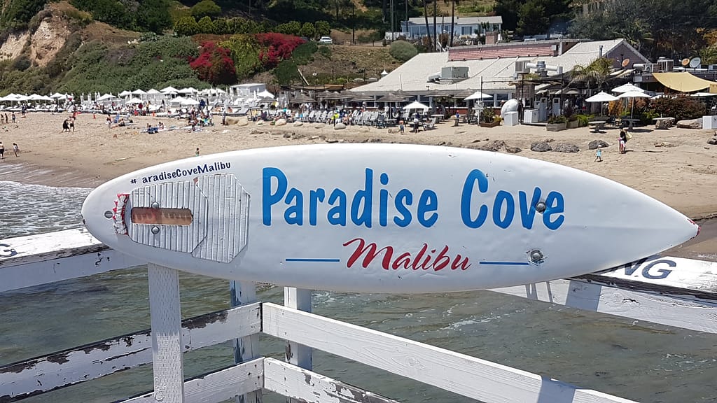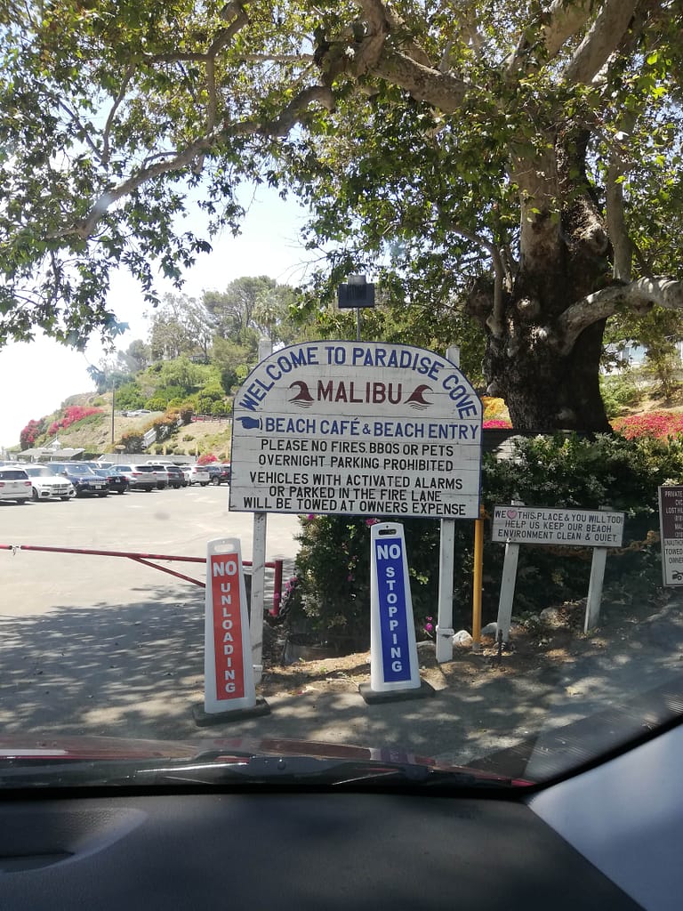 Wir erreichten über den Highway 1 die ersten Ausläufe von Malibu. Wir dachten, dass es teurer wird, je näher wir an unser Hauptziel, Los Angeles, kommen. Daher suchten wir uns einen schönen Strand aus und fuhren dort auf den Parkplatz. Wir machten uns gerade auf den Weg zum dort ausgewiesenen Paradise Cove Pier, wurden aber von einem Strandwächter aufgehalten, der meinte, wir müssen noch ein Parkticket lösen.