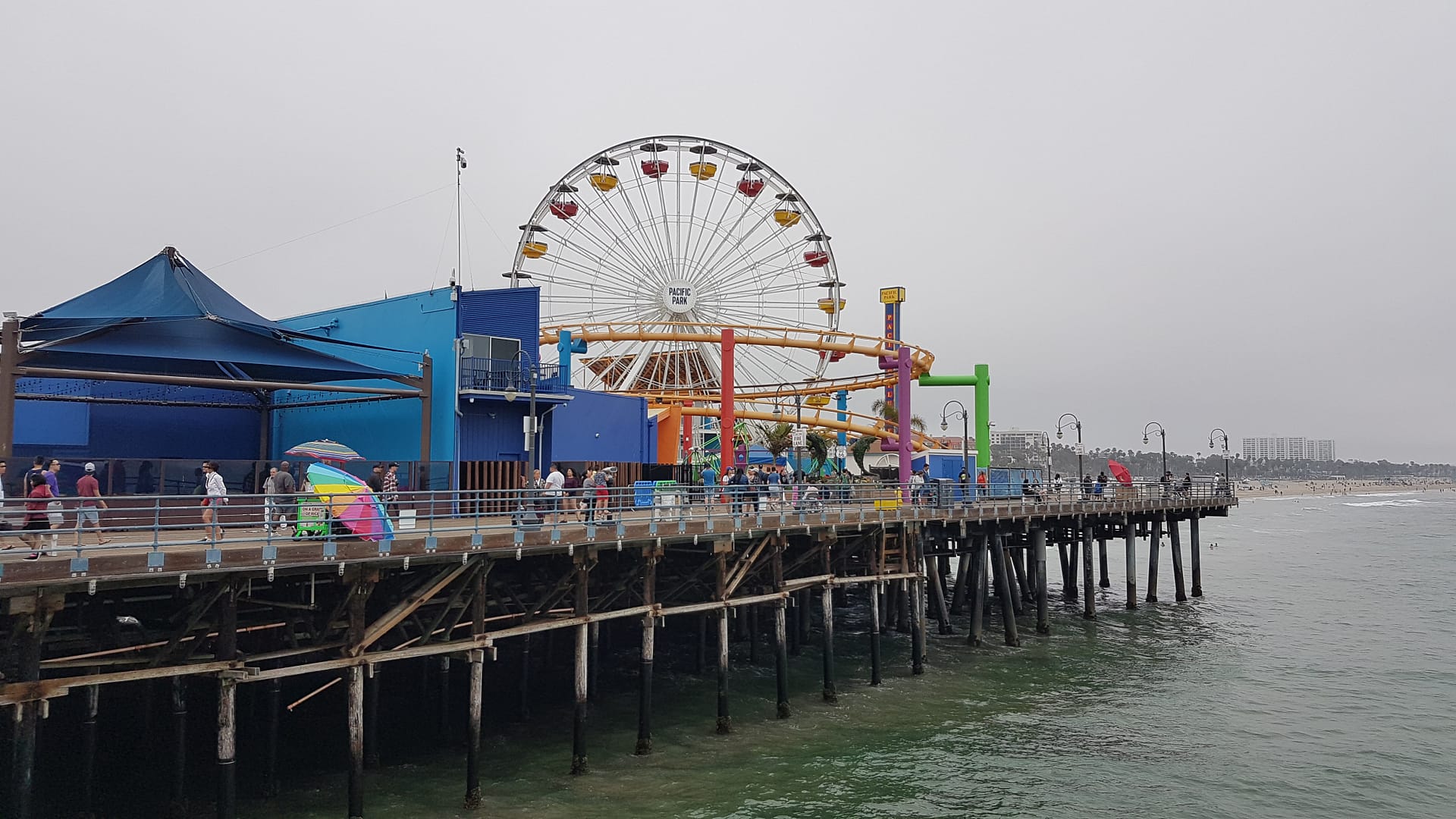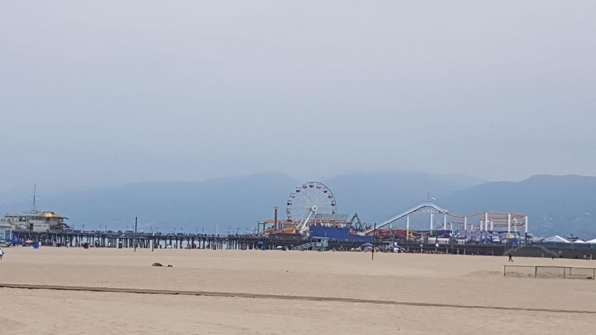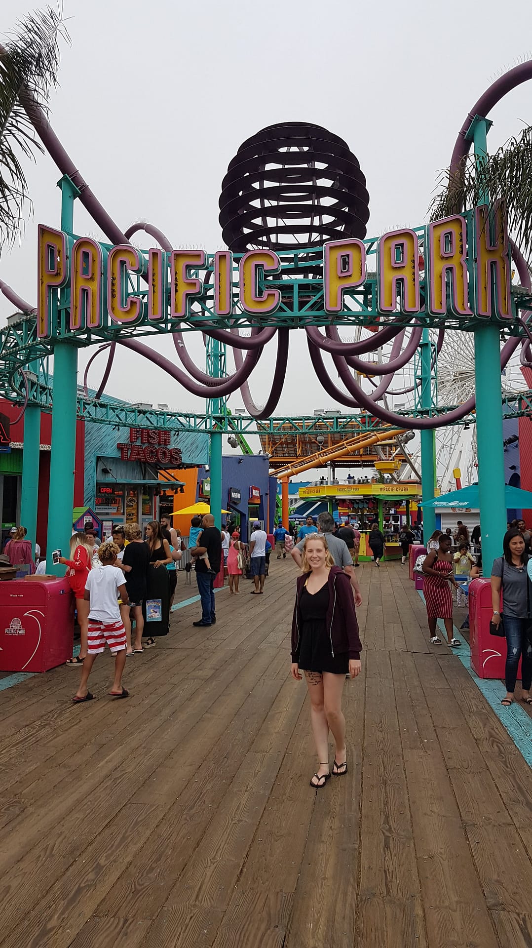 Dennoch ging es weiter, bis wir nach Santa Monica kamen. Dort suchten wir einen Parkplatz (und fanden sogar ziemlich schnell einen!), von dem wir gut zum Santa Monica Pier laufen konnten. Auf diesen beiden zusammengebauten Piers befindet sich der Pacific Park. Ein Vergnügungspark mit einem Riesenrad, einer Achterbahn, einem Karussell, vielen Restaurants, und viel mehr, der das ganze Jahr geöffnet hat. Zugleich befindet sich an diesem Pier das Ende der berühmten historischen Route 66, welche im etwa 4000 (Straßen-)Kilometer entfernten Illinois, Chicago startet.